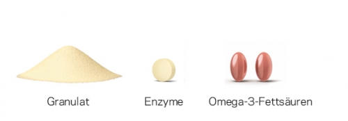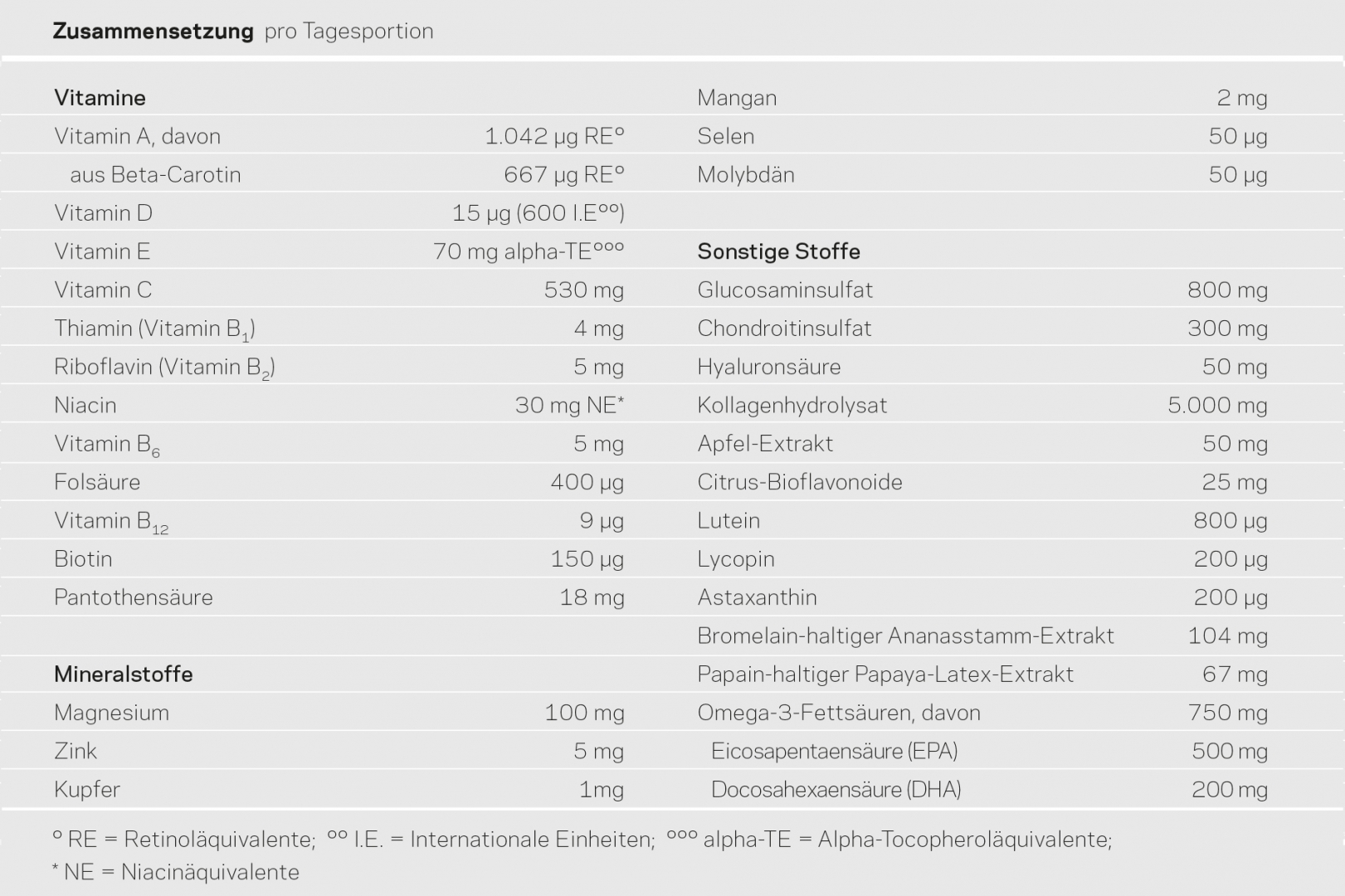 Dextrose, Kollagenhydrolysat (aus Rind) (26 %), Maltodextrin, Säuerungsmittel Citronen-säure, D-Glucosaminsulfat (aus Krebstieren), Fischöl (5,2 %), L-Ascorbinsäure, Magnesi-umcarbonat, Chondroitinsulfat, Gelatine (aus Rind), Feuchthaltemittel Glycerin, Füllstoff Calciumphosphate, Trennmittel Siliciumdioxid, DL-alpha-Tocopherylacetat, Bromelain-haltiger Ananasstamm-Extrakt (aus Ananas comosus) (0,7 %), Füllstoff mikrokristalline Cellulose, Aroma, Papain-haltiger Papaya-Latex-Extrakt (aus Carica papaya) (0,4 %), Natriumhyaluronat, Polyphenol-haltiger Apfel-Extrakt (aus Malus sp.), Zinkgluconat, Süßungsmittel Acesulfam K, Bioflavonoid-haltiger Citrusfrucht-Extrakt (aus Citrus sp.), Nicotinamid, Emulgator Soja-Lecithine, Calcium-D-pantothenat, Trennmittel vernetzte Carboxymethyl-cellulose, Überzugmittel Ethylcellulose, Hahnenkammextrakt, Pyridoxinhydrochlorid, Mangansulfat, Riboflavin, Thiaminmononitrat, Farbstoff Eisenoxide, Beta-Carotin, Trennmittel Magnesiumsalze der Speisefettsäuren, Kupfersulfat, Stabilisator Natriumalginat, Überzug-mittel Hydroxypropylcellulose, Überzugmittel Hydroxypropylmethylcellulose, Trennmittel Talkum, Astaxanthin, Lutein aus Tagetes erecta-Extrakt, Retinylacetat, Farbstoff Calcium-carbonat, Pteroylmonoglutaminsäure, Lycopin (aus Solanum lycopersicum), D-Biotin, Natriummolybdat, Natriumselenat, Cholecalciferol, Cyanocobalamin