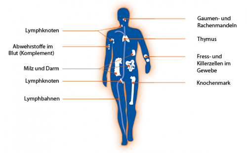 Milz, Mandeln, Lymphknoten sowie spezielle Blutzellen. Die Immunabwehr besteht aus einem